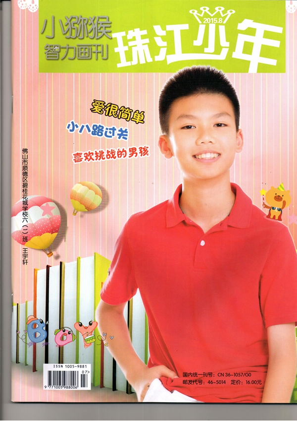 热烈祝贺碧桂花城学校国际班学生王宇轩同学成为《珠江少年》书刊的封面人物。王宇轩同学在就读我校国际班期间,上进心强,品德优秀,乐于助人,各方面都能严格要求自己,受到老师的一致好评,并多次被评为“优秀班干部”、“三好学生标兵”。我们希望宇轩同学在今后的学习生活中能扬帆起航,驶向更辽阔的海洋。