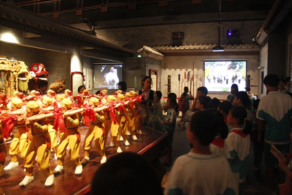 进到大门里,光线就暗了下来。讲解员姐姐就带着我们到了展厅参观了。展厅里有古代的银行、茶楼、织布机、捕鱼捕虾的工具、标杆、水车、还有一组在跳舞的小木头人,他们围成一圈,有人抬着别人,他们都穿着红色的衣服,有个人戴着龙头,有个人戴着龙尾。讲解员还给我们讲了以前的人是怎么结婚的。接着我们又看到了鱼灯。你们知道鱼灯是什么时候放的吗?告诉你们吧,鱼灯是中秋节放的哦。