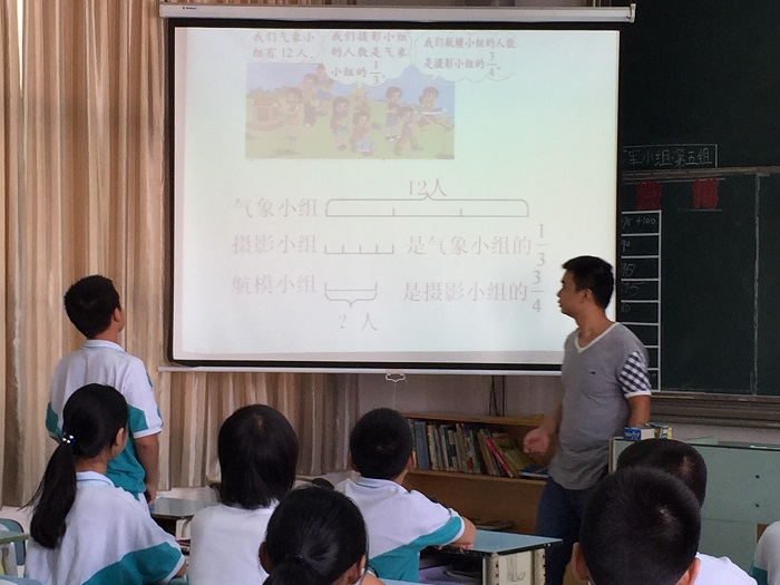 谭伟老师的《分数混合运算(一)》,则从针对性的复习题切入,抽丝剥茧,循循善诱很快让学生熟练掌握了运用连乘来解决数学问题的基本方法。然后让率先理解掌握的学生上台讲解,同学们纷纷踊跃地争取当小老师的机会,课堂气氛十分活跃,谭教师把课堂的舞台交给了学生,自己专注引导和总结。这种方法非常值得大家学习。