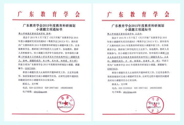我校张峰老师申报的书法小课题 《开展每日习字提高小学生书写水平的实践研究》和王在和老师申报的体育小课题《功夫太极扇对学生体能素质提高的实验研究》,经小课题立项评审专家组评审,通过立项,同意两项小课题为广东教育学会2015年度教育规划小课题,小课题编号分别为:GDXKT5008和GDXKT4619。