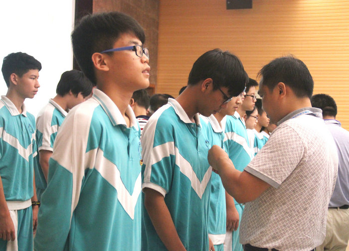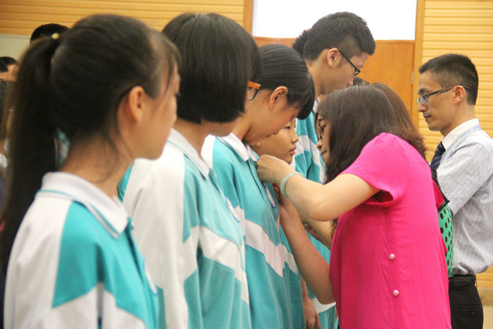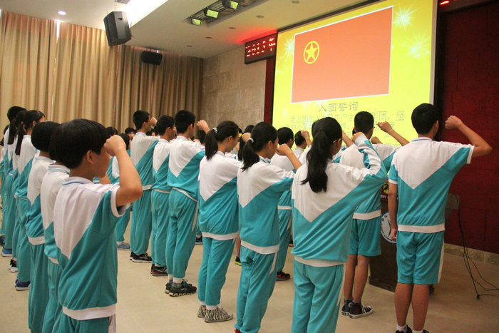 同学宣布完新团员名单之后,老师们为新团员佩戴了团徽。老团员蓝青同学带领大家在团旗前进行了宣誓,表示自愿加入共青团,在以后的日子里勤奋学习,吃苦在前,享受在后。王瑶同学代表新团员发言。