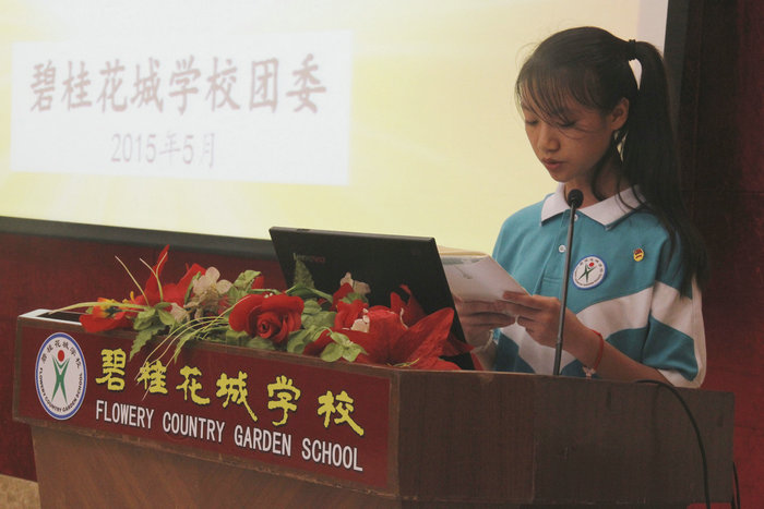 七、八、九年级全体师生首先观看了《碧桂花城学校2014年德育团队工作总结》专题片,近十分钟的视频,回顾了我校去年德育、团队工作开展情况及取得的成绩,博得了一片赞许的掌声。接着团委书记刘志伟老师汇报了今年以来团委、少先队以及初中组开展的各项工作,鼓励同学们还要努力学习,积极参与学校各项活动,传递正能量。