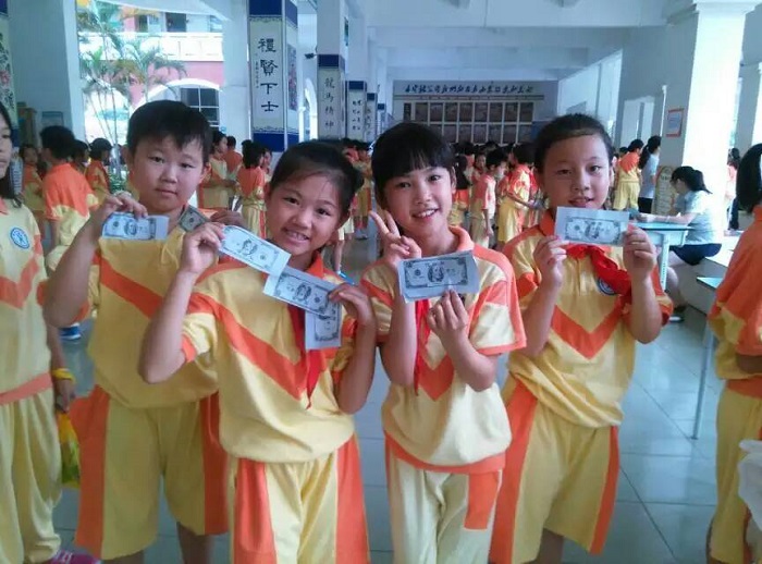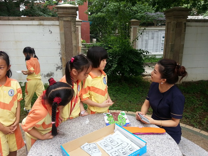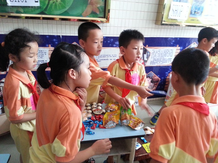 活动设置了货币区和商品区。在货币区,孩子可以通过玩英语游戏来获得一元到十元不等的代金券,游戏的难度系数越高,代金券数额则越高。游戏有“Memory Game”, “Flash Eyes”, “Reading Game”, “Throwing the chopsticks”“Answer the questions”等等。看,孩子们在游戏中多投入,不仅展示了自己的各类才艺,赚到了代金券,还学到丰富的英语知识!再看“英语超市” 内的商品堪称是琳琅满目!挣得代金券的同学们必须使用英文才能进入“超市”购买自己喜欢的商品哦!买卖双方须用英语进行沟通和完成交易。
