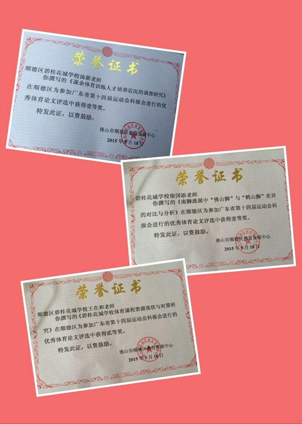 在刚刚结束的广东省第十四届运动会科报进行的优秀体育论文评选中,我校汤新老师撰写的论文《课余体育训练人才培养近况的调查研究》荣获区一等奖;徐国添老师撰写的论文《南狮流派中“佛山狮”与“鹤山狮”差异的对比与分析》荣获区一等奖;王在和老师撰写的论文《碧桂花城学校体育课程资源现状与对策研究》荣获区二等奖。