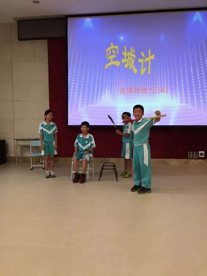 接下来就是同学们期待已久并且准备了很长时间的“名著故事表演”环节。同学们利用课余时间把自己喜欢的故事情节改编成小剧本,经过老师的精心筛选,每个班挑选了一个节目进行汇报表演,甚至有些班级已经在班内就已经举行过初选了。所以四个节目虽然都选自中国四大古典名著,但风格不一。五(1)班的《空城计》,小演员们在服饰上极具现代风格,演员们台词功夫扎实,最后获得“最具潜力奖”;五(2)班的《三顾茅庐》,刘关张和诸葛亮的表演者那举手投足之间已经把人物的特点演绎得几近专业,最后获得“最佳创意奖”;五(3)班表演的是《大话西游》,演员阵容强大,故事情节极具穿越感,带给师生们阵阵欢笑,获得了“最具人气奖”;五(4)班虽然也是表演《空城计》但演绎方式和重点却有别于上个节目,他们的道具准备充足、紧张的气氛营造得逼真,最后获得“最佳舞台风采奖”。名著表演环节在同学们阵阵热烈的掌声中结束。