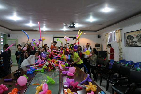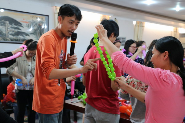 “授之以鱼,不如授之以渔”。杨老师对大家的培训也是花了不少心思,通过最简单的方法给大家带来最实用的技能。通过“小花”和“佛珠”的造型练习,教给大家两个基本的拧气球手法。老师们兴趣浓厚,虚心学习,拿着气球一遍又一遍的进行尝试。拧气球看似简单,但还需要技术与技巧,一不小心气球就可能爆开。接着,杨老师开始教大家变化出各种的造型,杨老师说:“拧气球是需要想象力的,通过这些基本的手法,我们可以创造出各种的好玩的东西。”大家在杨老师的鼓励下,越拧越起劲,整个会场笑声不断,大家兴致高涨,既害怕炸开,又放不下手中的气球,最后一个个有趣生动的气球造型呈现在老师们手中。