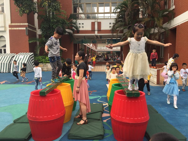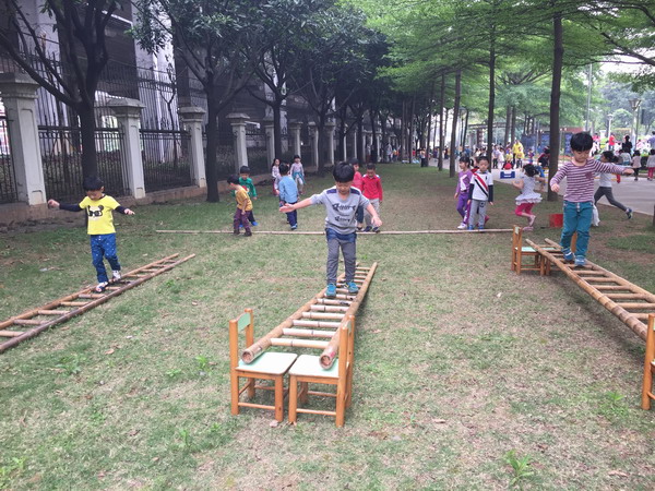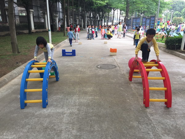 一直以来,碧桂花城幼儿园非常重视阳光体育教学活动,根据幼儿发展的需求,投入大量资金购买了立体钻山洞、平衡桥、梯子、羊角球、滚筒、呼啦圈等活动器械。为了让“阳光体育”项目活力常在,老师们集思广益,不断变化活动形式和运动器械搭配方法。首先是“巧借环境”, 园内场地平坦清洁,大、中、小型体育器械整齐排放在不同的区域,让不同年龄的幼儿爬、钻、匍匐、平衡、攀登,从而发展幼儿的动作协调能力。第二是“巧设梯度”, 在活动中安排一个个能力“坡度”, 通过精心设计的动作,适度增加活动量或提高活动难度,让幼儿不断体验到成功的喜悦。最后是“巧用器材”,让幼儿自由自主地活动,他们选择最感兴趣的项目进行活动,让常见器材发挥新功能,让幼儿在运动中探索,在玩中学习。