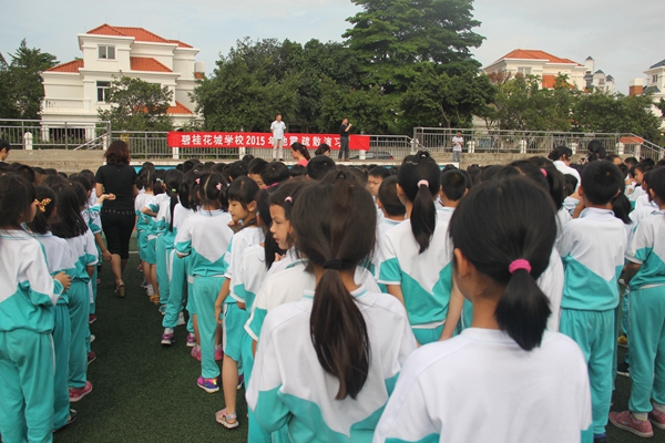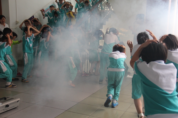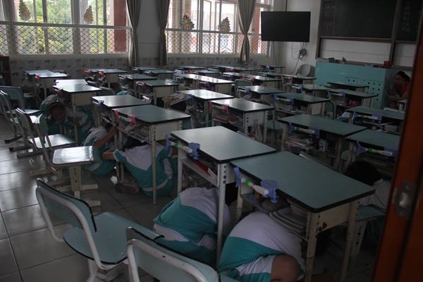 下午4:20,广播里传出一阵地震来临时楼房倒塌的声音,学生们迅速躲到课桌旁边,等声音停止了,马上离开教室,朝离教室最近的楼梯跑去,所有学生都用双手抱住头,在奔跑的过程中,能做到快而有序。此时,老师们站在楼梯转弯处指挥,等学生们全部离开教学楼,老师们最后离开,这样安排,是为了在地震来临时,不落下一个学生。所有学生都撤离到学校操场上,时间仅用了2分09秒。各班清点报告人数后,谭家文副校长为本次演习活动做了精彩的点评,谭校长肯定了这次活动非常成功,表扬同学们在演习过程中认真、迅速、有序,并希望全体师生通过这次演练,能真正使大家提高安全意识和逃生应急能力。