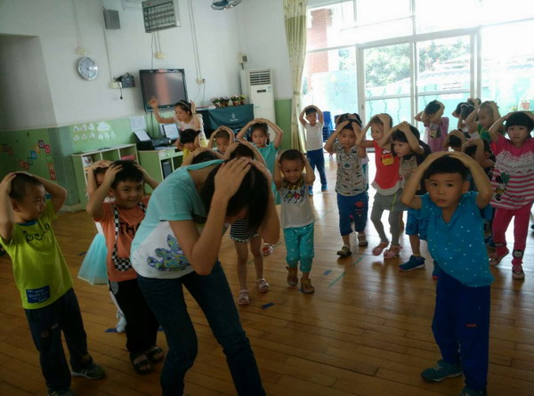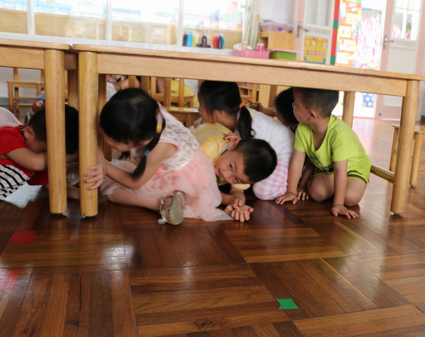 2015年5月14日下午,碧桂花城幼儿园进行地震疏散演习。听到警报声的响起,老师们首先安定幼儿情绪,组织幼儿躲藏到教室内的安全地带,待到稳定之后,教师组织幼儿有序地按照安全指示路径逃生,幼儿们手捂头部,弯着腰,迅速地撤离到升旗广场,没有出现拥挤、碰伤、踩踏等安全事故。随后陈文丹助理对这次防震演习进行总结,陈助理教小朋友们如何在危险来临时最大程度地保护自己。最后陈助理还布置了一个任务,让幼儿回家与父母讨论,如何在地震时更好地逃生。
