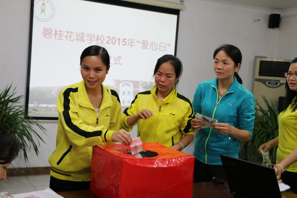2015年3月30日,碧桂花城幼儿园响应“碧桂园员工扶助基金会”精神,启动2015年“爱心日”捐款仪式,每位教职工都献出了一份爱心。