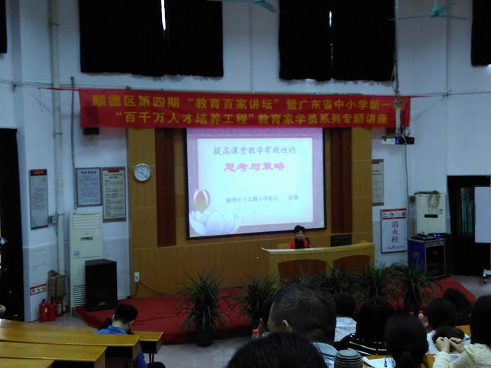 本周二下午,谭家文副校长带领数学组的两位老师参加顺德区第四期“教育百家讲坛”暨广东省中小学新一轮“百千万人才培养工程”教育家学员系列专题讲座,来自广州市小北路小学的彭校长给大家讲了提高课堂教学有效性的思考和策略。彭校长指出有效教学是教师遵循教学活动的客观规律,以尽少的时间、精力、物力投入,取得尽可能多的教学效果。作为老师首先要拥有有效教学的理念,掌握策略或技术,从知识技能的掌握、学习过程的感悟、情感过程的体验三方面去考察学生的发展和进步,从对专业知识的深化、专业技能的提高、专业情意的升华三方面去检验教师的成长,且指出有效教学的基本框架是要具备创建促进学习的环境、研究并理解学生、明晰目标与组织内容、提供多样的学习机会、促使学生学会学习,并且要持续的教学反思与创新。