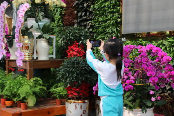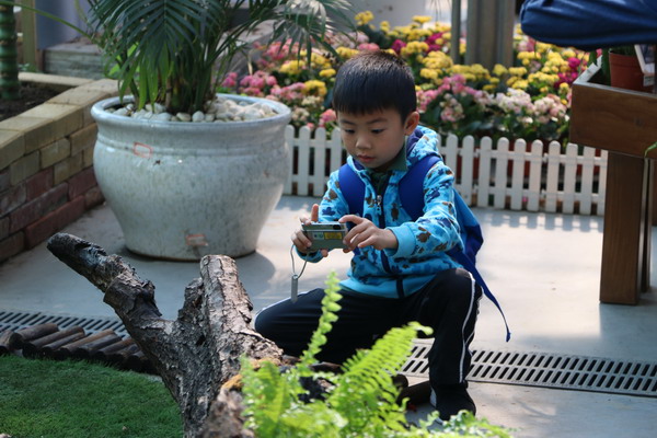 花卉体验馆内1500多平米实景花园到处开满了鲜花,有粉红色的海棠花,蓝色的一串蓝,还有红色的凤尾球;有娇小可爱的洋凤仙,优雅的香彩雀,还有热情的波斯菊。这里姹紫嫣红的花朵,温暖的阳光,还有飞舞的蝴蝶共同组成了一幅春天的画!本学期我们的探究课题之一就是《奇妙的花卉世界》,包括认识藤蔓植物、花盆造型、树枝造型等内容,我们都能在这个体验馆里找到富有艺术性的解答。看,小朋友们正拿着相机在花丛中捕捉春天的影子:
