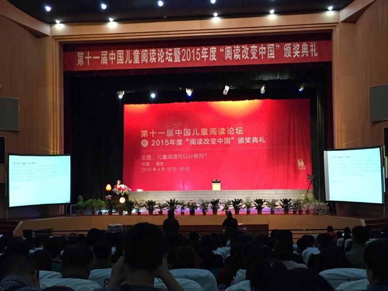 16日下午,我们一行四人来到古色古香的六朝古都――金陵,参加由亲近母语研究院、中国教育新闻网和南京市栖霞区委宣传部联合举办的“第十一届中国儿童阅读论坛暨2015年度‘阅读改变中国’颁奖典礼”,开始为期两天半的学习。本次论坛现场到会1200多名代表,他们来自全国29个省市自治区,来自学校、出版、公益、阅读推广机构等,共同探讨和学习 “儿童阅读可以分级吗?”的主题。