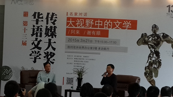 三月二十一日下午,我校派出八位老师参加了此次活动。本次活动主要采取对话的形式,著名作家阿来和中山大学教授谢有顺老师就热点文学话题,进行了激烈的讨论。