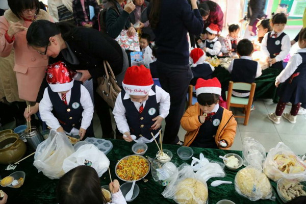 第二个环节是亲子制作心愿卡的温馨时光,家长和孩子们一起在心愿卡上写下美好的祝愿,挂在圣诞树上,寄托美好的愿望。紧接着孩子们互换礼物,和同伴分享快乐。最后,家长和孩子们移步到外面,享用美食。这次的“贺圣诞、迎新年美食嘉年华”活动,不光有孩子展示的舞台,同时,也有家长展示的空间。你看!琳琅满目的各种特色小吃、甜品、糕点、丰富的菜肴,全是出自家长们的巧手。在场的孩子们吃得开心,大人们也边尝边交流着厨艺心得,现场气氛其乐融融。