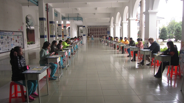4日下午4点10分,各项工作准备就绪。活动现场气氛紧张严肃。准备区内,考生们全神贯注,认真备考。面试区里,20名考官分别就考生自选的考题与考生进行面谈,并从考生的语言知识、应变能力和现场表现力等方面对考生进行评估。在场考生回答问题时姿态落落大方,充满自信。在短短的两分钟时间内,自然流利地完成自我介绍、朗读短文和自由问答三个面谈环节。