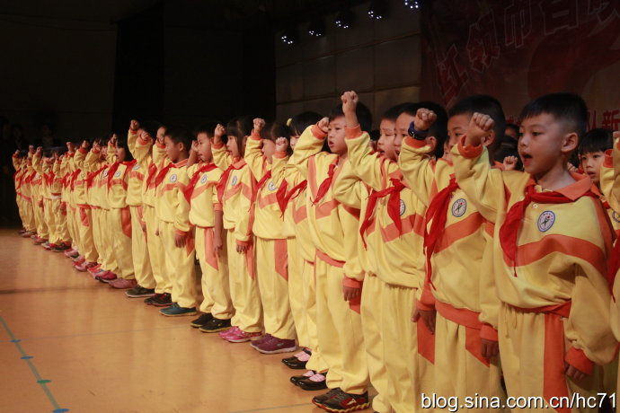 紧接着,欢快的乐曲声响起,一年级新队员们按照班级的先后顺序依次来到舞台中央,一张张可爱的笑脸是那么甜美、灿烂。之后,三年级老队员们捧着鲜艳的红领巾也来到了舞台上,他们细心地给学弟学妹们戴上了鲜艳的红领巾。看着胸前的红领巾,新队员们更自信了,他们举起右臂,在少先队大队长的带领下庄严宣誓,那铿锵有力的声音响彻会场。而家长们此时也没忘记记录这个难忘的时刻,他们纷纷举起手中的相机,记录这难忘的瞬间。