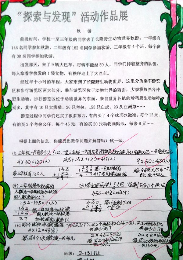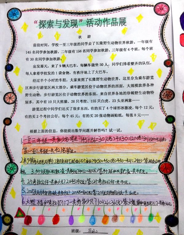 为了培养学生数学探索精神,提高实践能力,发展学生的应用意识和形成解决问题的策略,让学生进一步体验数学源于生活,用于生活的理念。我校三年级全体学生于11月24至27日举行了“探索与发现”活动。在活动中,以孩子们刚刚参加过的秋游活动为情境,让孩子们在这个情境中寻找数学信息,并提出相应问题、解决问题。学生们充分发挥自己的聪明才智,认真提问题并解决问题。活动结束后,每个班选出5名小评委到各个班评选优秀作品。活动最终评选出了41份优秀作品,并获得“数学提问高手”称号。