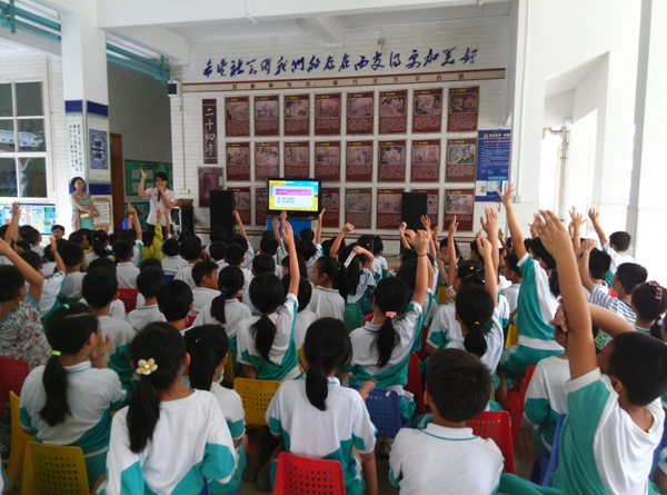 10月10日下午,我们三年级全体师生在教学楼下举行了本学期快乐英语聚会――英语秀。 “copy, copy, copy me do…”随着一首欢快的英文歌曲,拉开了快乐英语秀的序幕。