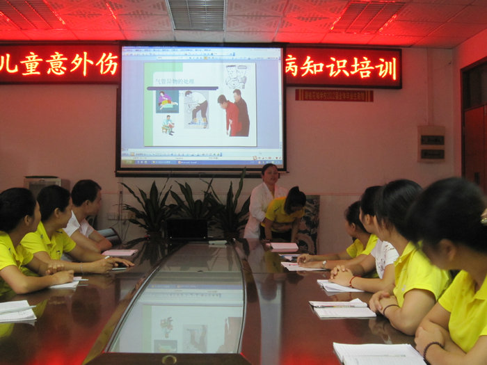 培训中,洪医生借着图文并茂的课件用通俗易懂的语言,认真讲解了孩子受伤时如何止血――如鼻出血、擦伤时的止血方法,如何区分扭伤与骨折及几种骨折的院前急救固定方法,呼吸道异物的急救方法,烧伤烫伤的处理方法,并生动讲解了中毒、溺水、触电等紧急处理方法。