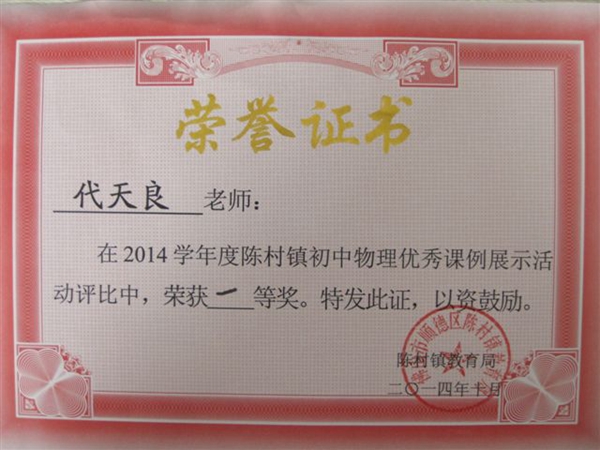 10月30日上午,我校代天良老师在镇初中物理优秀课例展示活动中获得一等奖,在此对他所取得的成绩表示祝贺。