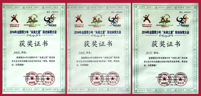 我校在2014年全国青少年“未来之星”阳光体育大会文化交流展示活动中成绩喜人,有3名学生的书法作品获奖。我校能有3幅书法作品获奖并得到展示,实属不易。其中,三(3)班刘淑娟、原六(2)班杨佩琪两位同学的书法获得全国二等奖、四(2)班高子月同学的书法获得全国优秀奖。(文\图 张峰)
