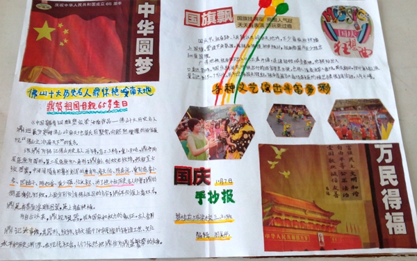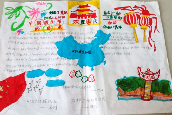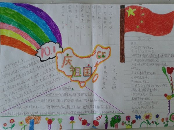 今年是祖国六十五周年华诞,为了激发孩子们的爱国之情,国庆假期,三年级布置了一份特殊的作业,做一份手抄报参加三年级“庆国庆”手抄报大赛。