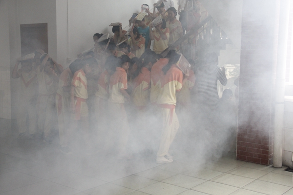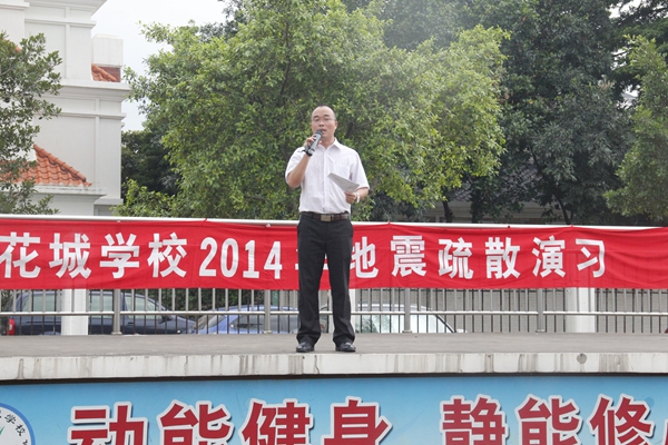 随着第一声地震报警信号的响起,全校师生迅速抱头躲到桌子底下,紧急避险。16点10分,随着第二次尖锐而又急促的警报声,所有班级打开教室前后门,学生在老师指挥下,左手拿书本护住头,右手捂住口鼻,弯腰迅速、有序、安全地从教室向前操场撤退。各楼层负责老师在楼梯拐角处协助各班老师组织学生进行疏散,防止学生拥挤、摔倒、踩踏等意外事故的发生。全体师生在二分零三秒钟内全部安全疏散到了操场。班主任进行整队和清点学生人数,向现场总指挥报告。整个演练组织严密,有条不紊,做到了安全、迅速、有序,师生互助有序、配合默契,学生动作敏捷、规范,没有推拉、冲撞、拥挤现象发生,达到了演练的目的和预期的效果。