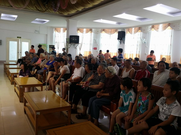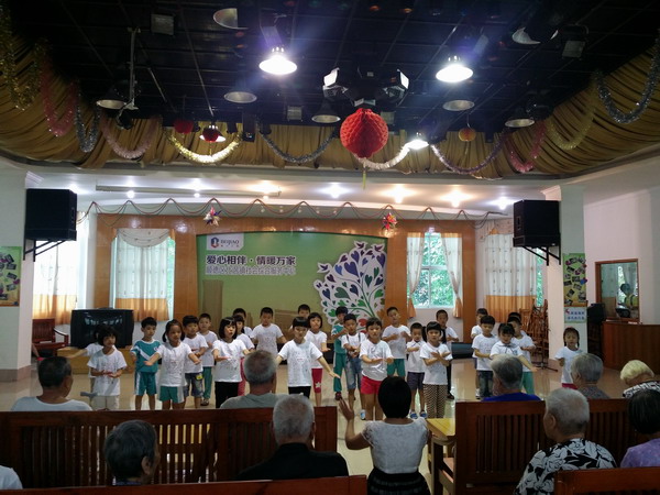 到达目的地,院长带领我们走到二楼的小歌剧院,孩子们一进去就被这么多的老人家吸引住了,都非常有礼貌地向他们问好。在院长向在场的爷爷奶奶们介绍了本次我们到来的目的后,就是表演时间。首先是国际小一班带来的舞蹈《公主宝贝》,接着是口风琴班表演、国际中班的歌曲串烧、国际大一班的歌曲联唱、国际小二班的歌舞《爸爸去哪儿》、模特班的《我是小小模特》、国际大二班的《把爱传出去》。稚嫩的歌声、甜美的舞姿、可爱的表情,传达了孩子们对全体爷爷奶奶的敬爱之情。最后就是给全体老人送慰问品――爱心杯子。这些杯子是用社团义卖活动筹得的善款所购买,由小朋友们亲手把礼物送到爷爷奶奶手上,并说些祝福的话语,爷爷奶奶们都乐开了怀。