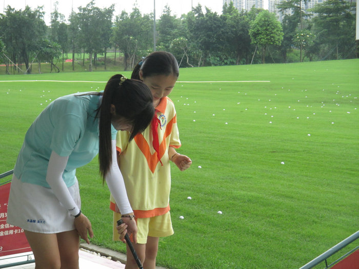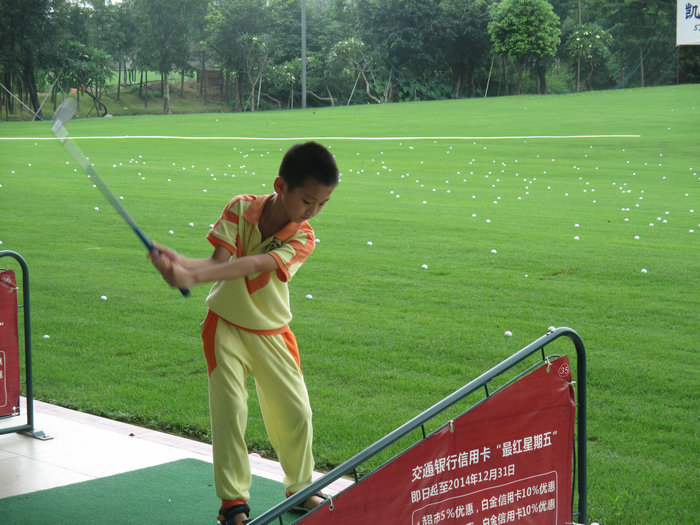 一路上,虽然太阳很猛烈,但丝毫阻挡不了我们喜悦的心情,我们踏着欢快的步伐,走了20多分钟就到了。走进漂亮的高尔夫球场,高尔夫教练热情地接待了我们。