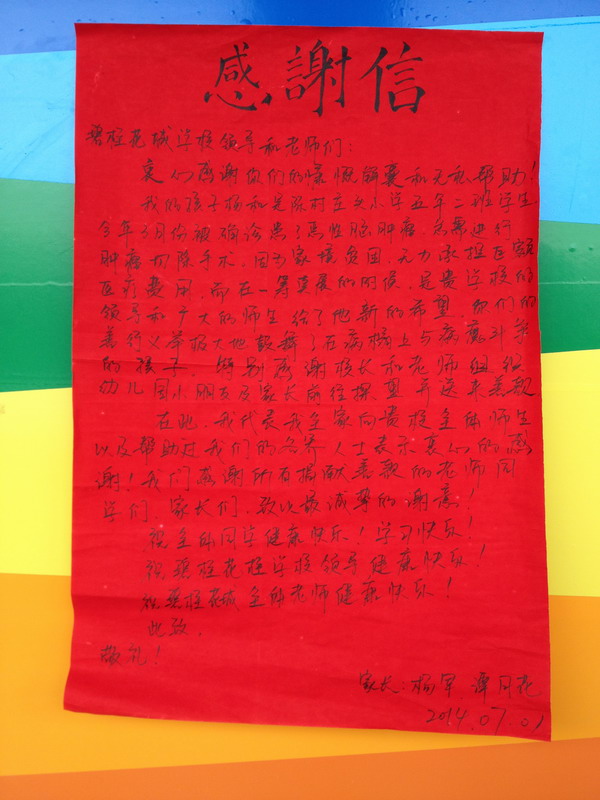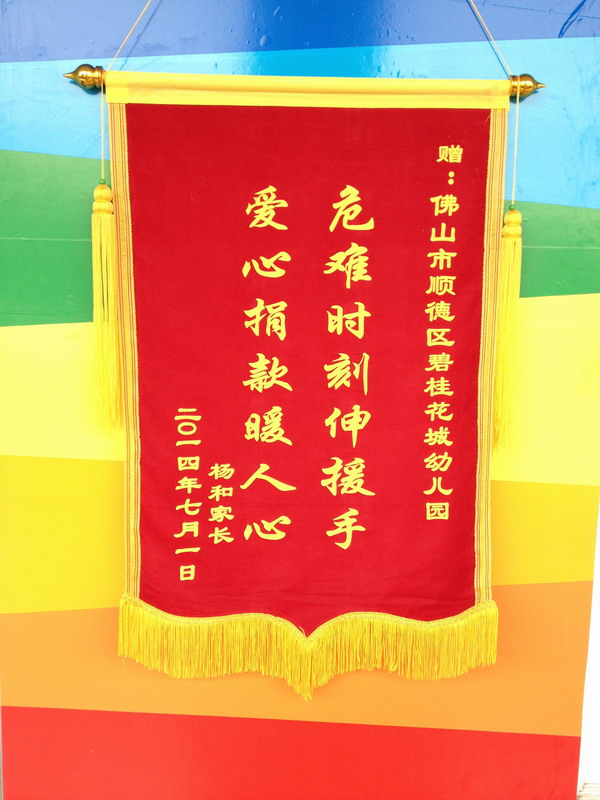 7月7日上午,捐助庄头小学生家长送来了一面绣有“危难时刻伸援手,爱心捐款暖人心”的锦旗及感谢信,表达了他们对我园的无限感激之情。