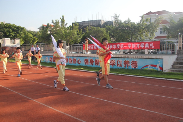 全校师生踏着欢快的运动员进行曲聚集在学校的足球场上,随着国歌响起,五星红旗随风飘扬,开学典礼在庄重而严肃的升旗仪式中拉开帷幕。尊敬的贺校长为本次开学典礼致辞,校长热情洋溢的讲话中,既表达了对新同学的欢迎,也提出了新学期的要求,号召全校师生新学期共同努力,营造和谐校园,让学习成为乐趣,让好习惯伴学生茁壮成长,希望每一位老师,同学都能以自己的勤奋与智慧书写新学年学习与工作的满意答卷。