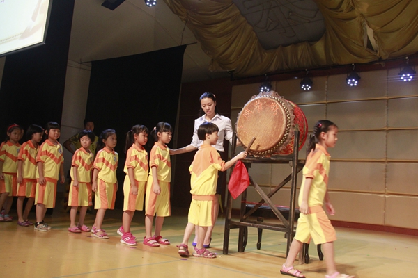 开笔礼分为以下几个环节:一、正衣冠;二、拜师;三、朱砂启智;四、击鼓明志;五、描红;六、学习传统文化。“正衣冠”目的就是告诉孩子们“衣冠不仅仅意味着遮羞,更重要的是反映人的精神面貌,所以要先正衣冠,然后才能明事理。”“拜师”表达对知识的尊敬。“朱砂启智”寓意着孩子从此眼明心明,好读书,读好书,这是孩子们最喜欢的环节。 “击鼓明志”其目的在于让孩子目明耳聪、茅塞顿开、建功立业。孩子们的描红选择了“人”字,之所以选择这个笔画简单而意义深远的汉字,是希望孩子们在人生的启蒙阶段学会做人,知道做人首先要堂堂正正地立身,要像“人”字那样顶天立地。紧接着,全场146名孩子齐声诵读《弟子规》、《三字经》,在琅琅书声中圆满结束了本次“开笔礼”仪式。