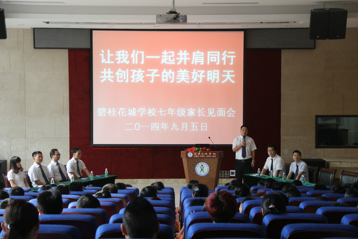 为了使七年级新生尽快适应新的学习生活,努力构建家长、学校、社会三结合育人体系,与家长携手做好新生的入学教育工作,9月5日下午4:00,碧桂花城学校在装修一新的阶梯教室召开了七年级新生家长会,近百名家长聆听、互动,气氛热烈。