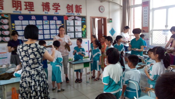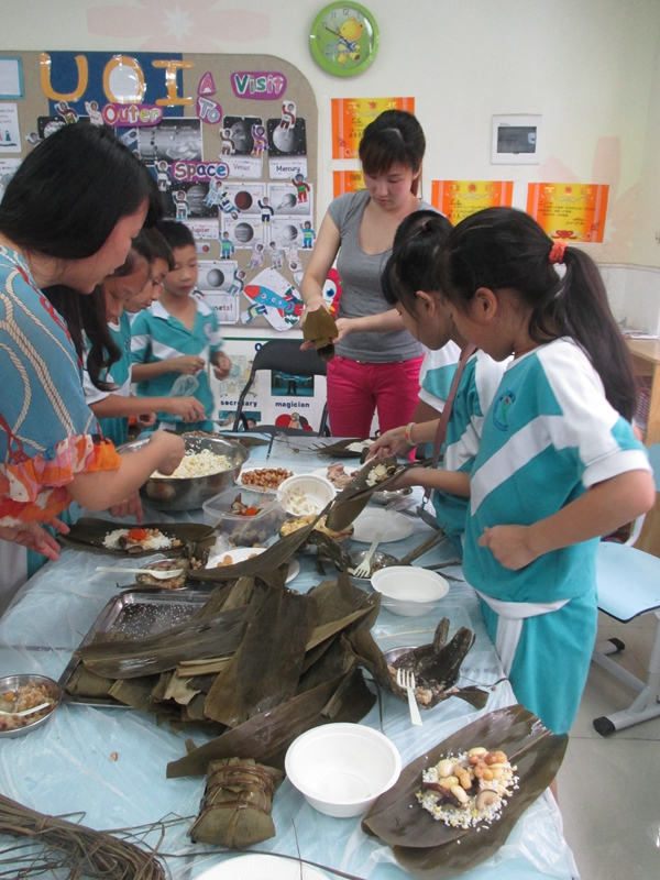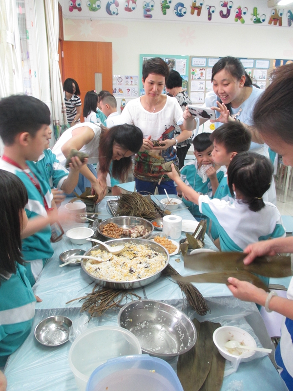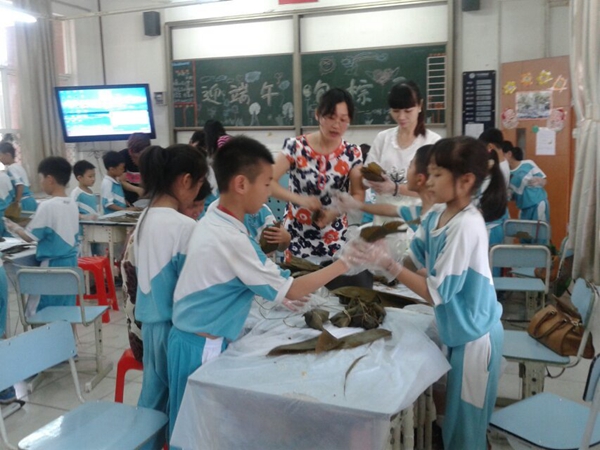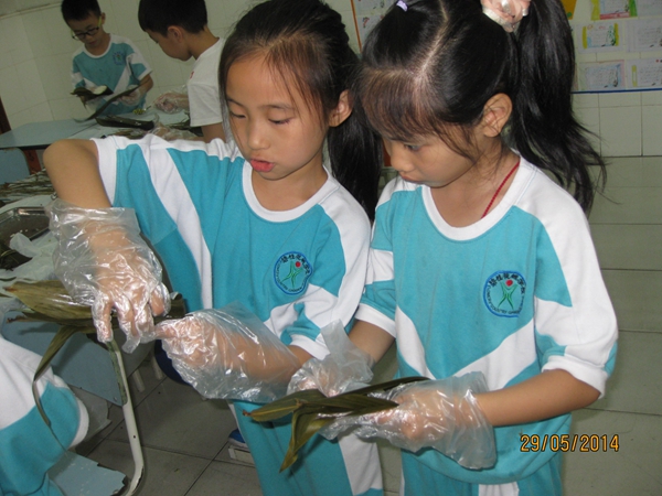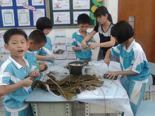 农历五月初五端午节,是我国最大的传统节日之一。为了庆祝这美好的节日,提高孩子们的综合素质,二年级组每个班特意请来了“新老师”――学生家长们,为可爱的孩子们上了一节特别的、有意义的综合实践课――学包粽子。家长们为了上好这节课,提前做了大量的准备工作,洗好粽叶、大米、豆子、瑶柱、瘦肉等作料,备好各类厨具等……