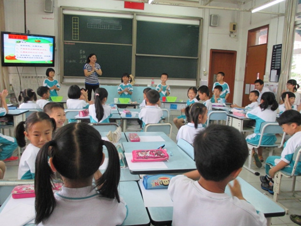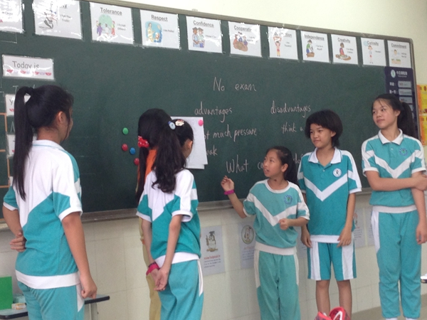 谢梅嫦老师的课真是让我体会到什么叫做国际班的大视野。一上课先是大家互相分享一周的新闻,同学们虽然只是小学生,但是人小见识大。风声雨声读书声声声入耳,家事国事天下事事事关心。从新闻引入本节课的探讨问题,小升初笔试的取消利弊之争。同学们开始各抒己见,发表自己的见解。然后依次上讲台展示讨论结果,此时的讲台就是学生的舞台。他们表现出来的那种大方,优雅,自信,勇敢,团结,睿智都给在场的老师们留下了极其深刻的印象。