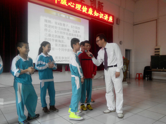 张老师先从“情绪”讲起,他让几位同学到台前做了几个有趣的小游戏,然后结合游戏过程进行及时的采访,让同学们理解了“情绪”的含义。接着,张老师结合生活实际,利用播放视频和幻灯片的方式,为同学们展示了情绪失控后造成的恶果,活生生的例子令人震撼,也引起了同学们的沉思。最后,张老师话题一转,以同学们的切身体会为例,引导学生学会如何在生活中调控自己的情绪,教给了孩子们很多适用的方法。