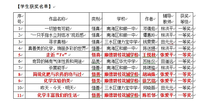 在刚刚结束的“2013学年佛山市中学生化学人文分享与交流活动”中,我校九年级王悦秋、胡涵姝、徐艺铭、陈若邻等四名学生均获得佛山市一等奖,碧桂花城学校化学教研组被评为“优秀组织奖”,我校张爱平老师被评为“优秀辅导教师”。