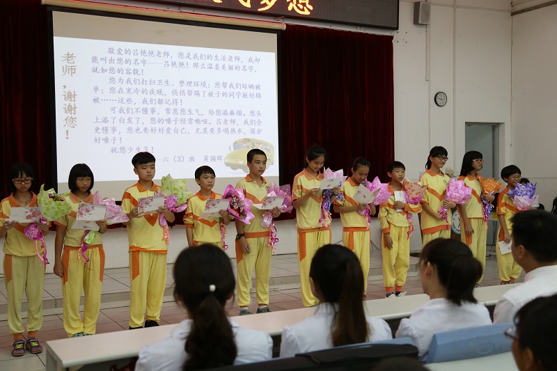 第三个环节是本次主题班会最重要的部分――师恩难忘。从一年级到六年级,孩子们遇到了许多好老师,正是这些老师,一棒接一棒,成就了孩子们今天的优秀。为了表达对老师们的感谢,六年级的孩子们特意给教过他们的三十多位老师――包括生活老师,准备了感恩卡和鲜花。老师们的一次次笑容、一句句鼓励,甚至连老师自己都不太记得了,但孩子们却一直铭记在心。当12位学生代表在台上将心中的感谢一字一句念出来时,将手中的鲜花恭恭敬敬地献给老师时,台下不少老师和家长都流下了感动的泪水。接下来的年级合唱《花城 我家》,更是唱出了孩子们对母校的感谢,对老师的感激。因为恰逢家长会,很多被邀请的老师不能亲临班会现场,会后,孩子们将鲜花和贺卡一一送到了其他老师的手中,将感激延伸扩展到教室之外。