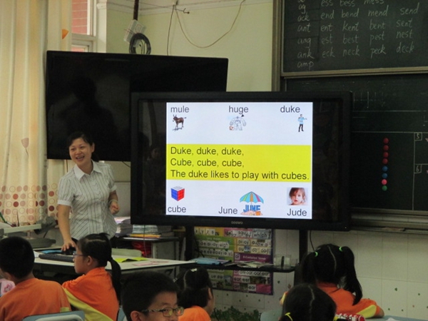 杨怡如老师上课的主题是Reading for fun,这节课教学步骤清晰流畅,教学设计大胆创新,教学效果非常好。本节课是以phonics教学活动为主,在已学的phonics “a_e”基础上教学u_e,以及相对应的单词认读和故事的拓展学习, phonics教学是杨老师的特长,她能从学生实际出发,创设出有趣的歌谣和朗朗上口的chant,在不知不觉中,学生已经掌握了含u_e 的单词发音,并能勇于大胆积极地去尝试新的chant,而且乐在其中,教学效果也就水到渠成。在这样的课堂操练中,学生的口语得到了很好的锻炼,学生的自信和大胆在这样的国际教育的大视野下也得到了最好的展示。