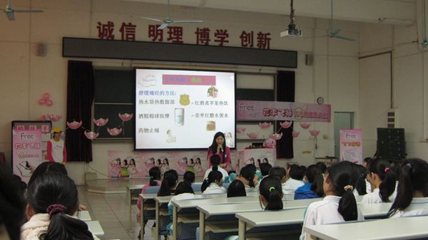 讲座在本校的阶梯室举行,参加讲座的有五、六年级女生和部分教师,主讲人是Free飞健康护理中心的青春期专职讲座老师飞姐姐。她主要从女孩身上所发生的变化和现象入手,用亲切的语言,详细解说了女孩在青春期的生理和心理的变化特点,指导学生在青春期应该保持个人卫生、学会自我保健。活动结合讲座、游戏的形式,参与学生从一开始的窃窃私语到大胆举手回答问题,更是在活动后表示“通过这次活动,我放下了自己心中的一块沉重的石头――青春期,青春期其实并不可怕”。