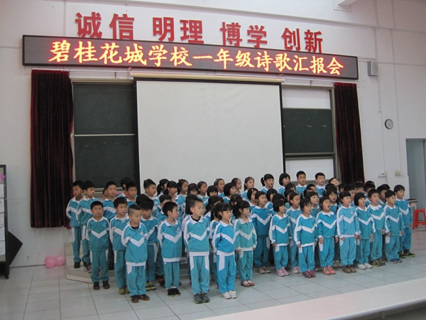 诵读中华经典,传承华夏文明,为继承和发扬中华民族经典文化,进一步打造书香校园,陶冶学生情操,碧桂花城学校小学一年级成功举行了 “弘扬民族文化,品味诗词精华”为主题的诗歌朗诵汇报会。