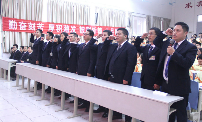 九年级全体教师坚定的誓言掀起了会议的又一个高潮。在年级组长吉正军老师的带领下,全体九年级教师庄严宣誓:“忠于职守,精诚团结;言传身教,以身作则!荣誉至上,同舟共济;全力以赴,永不言弃!洒汗水,昂扬斗志;战百天,创辉煌!与学生同甘共苦,为学生保驾护航!”