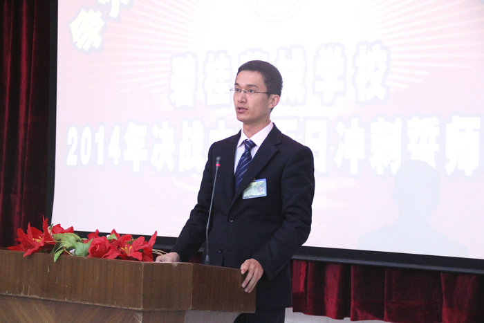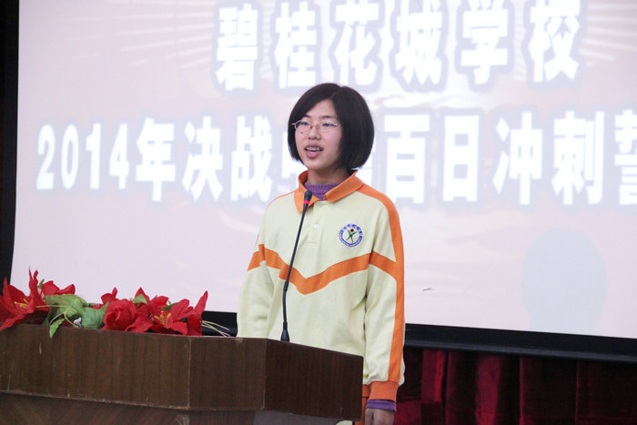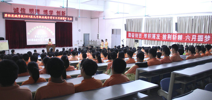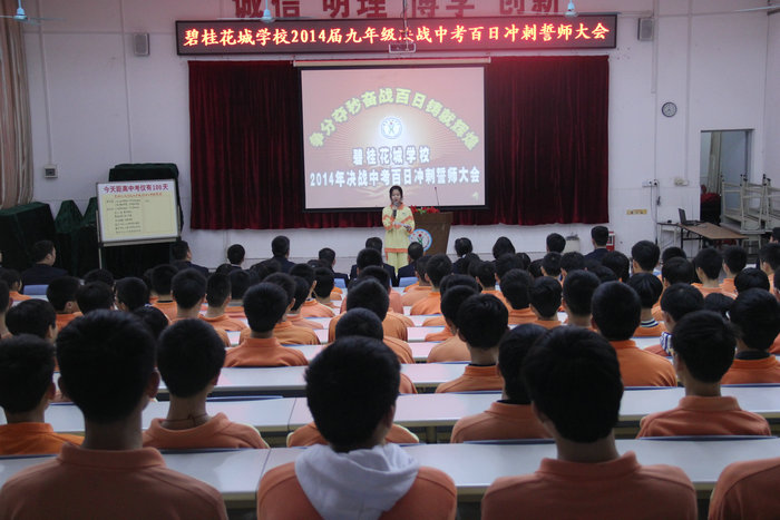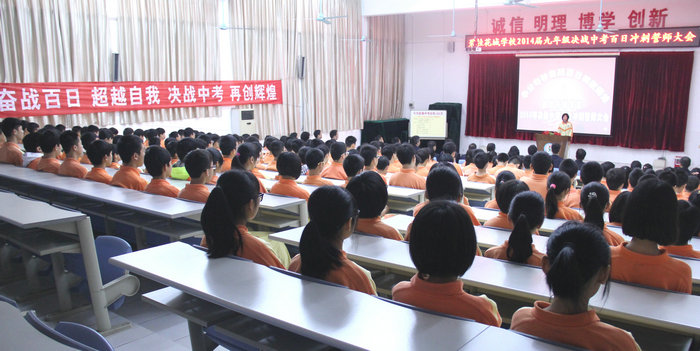 3月7日下午,细雨绵绵,但花城校园春意盎然。我校九年级“2014届决战中考百日冲刺誓师大会”在阶梯教室隆重召开,贺校长百忙中出席本次大会并作了重要讲话,出席大会的还有七、八年级全体师生。大会由九年级王悦秋、温卓霖两位同学主持。