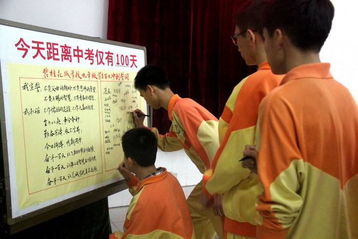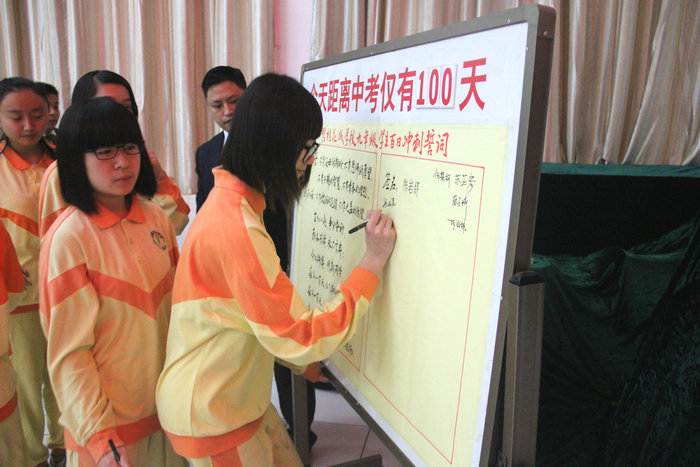 会上还隆重举行了签名仪式,在《超越梦想》的嘹亮歌声中,九年级69名学生依次在倒计时牌上庄严的签下自己的名字,也签下了自己对决战中考的承诺,会场响起了经久不息的掌声。