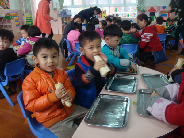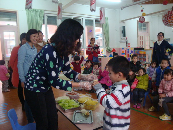 3月12日下午,碧桂花城幼儿园小二班的小朋友们,迎来了几位“新老师”。这几位“新老师”对孩子们来说并不陌生,他们都是班上小朋友的妈妈。这几位“新老师”配合小班的探究主题《食物》,带来了自己的独特活动――做墨西哥卷。“新老师”们事先准备了面皮、蛋皮、生菜、香肠等,教小朋友学卷的技能,发展幼儿小手肌肉动作。在活动中,孩子们的兴趣特别高,很认真的卷好了自己的“作品”,然后开始慢慢享用。吃一半留一半,孩子们还懂得要与家人分享呢!