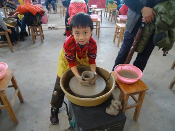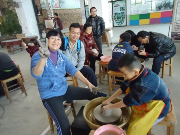 下一个活动就是要考验我们的创意了。大家纷纷围坐在陶泥盘前,亲生体验一下艺术创造的无穷乐趣。陶泥DIY既要心灵,还要手巧,更要耐心。Miss 颜等三位老师一边为我们拍照留念,一边鼓励和出点子。一个小时很快过去了,无论对成果是否满意,但我们都收获了过程的快乐!