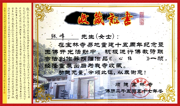12月19日上午,顺德宝林寺为了纪念寺院重光15周年, 顺德区文体旅游局、佛山市佛教协会、顺德宝林寺、顺德书法家协会举行玉佛开光暨佛教书画作品展活动,展出200多幅作品。展会吸引了顺德不少市民前来观看。我校张峰老师的书法作品《心经》入展并被宝林寺收藏。