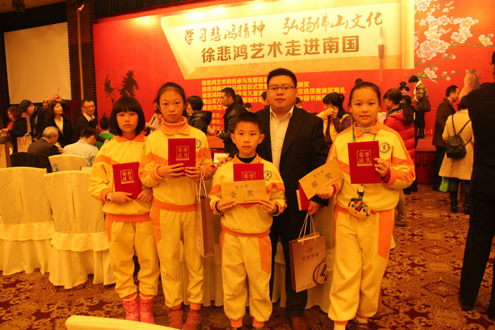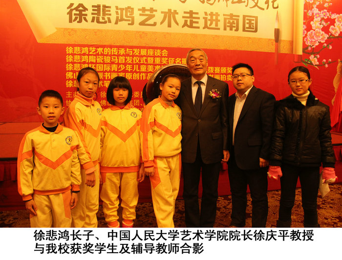佛山赛区共征集到五区中小学书画作品一千四百余份,我校四名学生的书法在此次大赛中取得一个特等奖和一个金、银、铜奖的佳绩。分别获得徐悲鸿长子、中国人民大学艺术学院院长徐庆平教授亲笔签名的获奖证书以及丰厚的奖金、奖品。