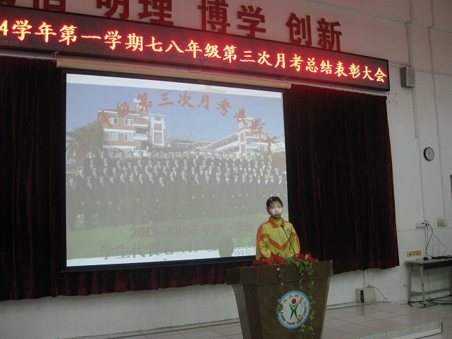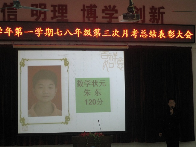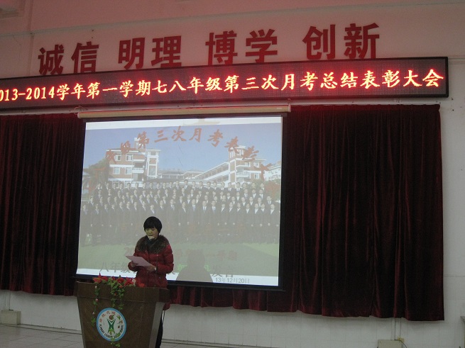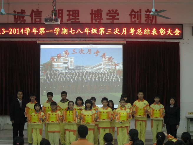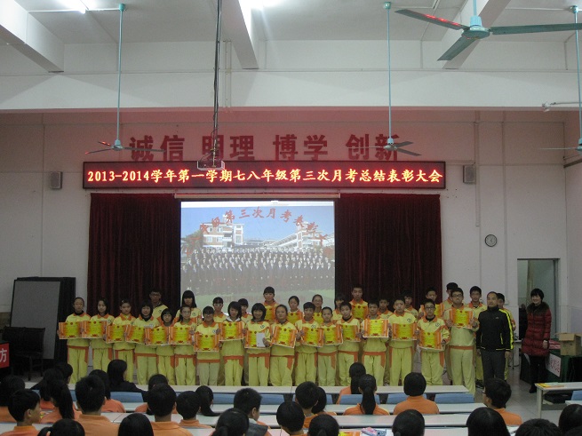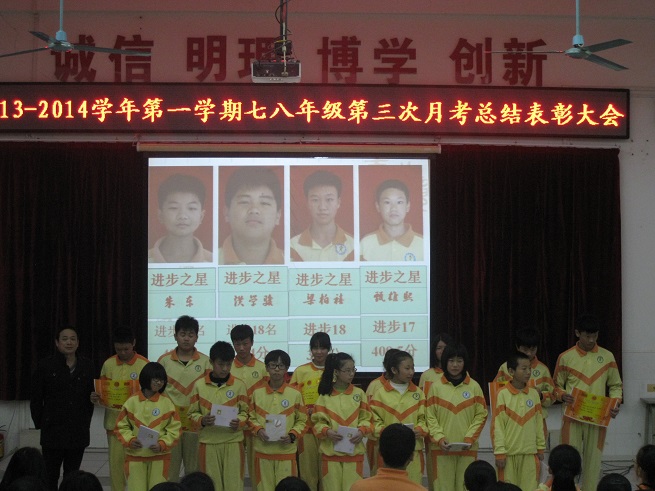 为表彰先进,激励后进,为全体同学树立学习的榜样,12月20日下午,我校七八年级全体师生在阶梯教室隆重举行第三次月考表彰大会。